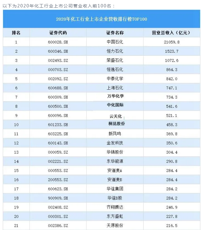 前十企業(yè)營業(yè)總收入共計28364.9億元。分別為:中國石化、恒力石化、榮盛石化、恒逸石化、中泰化學(xué)、上海石化、萬華化學(xué)、中化國際、云天化、桐昆股份。